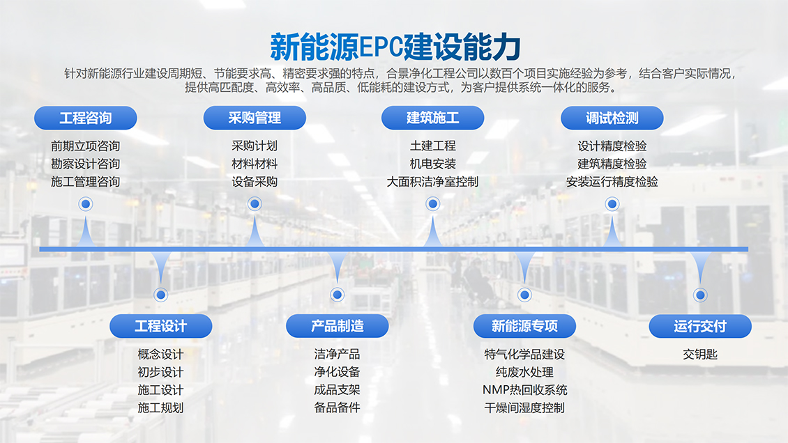 合景智慧建设是工业高端制造领域生产车间建设高洁净度和低露点净化车间内装工程的规划、设计、采购、施工与服务一体化总承包商,多年来,在大型厂房建设方面积累了大量丰富的低净化车间内装工程设计和施工经验,特别是在产能规划、公用工程、环境工程(温度、低露点、高洁净度)等领域的制造、工艺流程、节能环保等提供完善的系统集成工程建设解决方案。