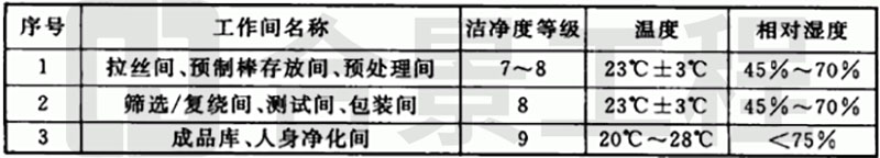 表4.1.5 光纤厂房洁净度等级和温度、相对湿度参数表