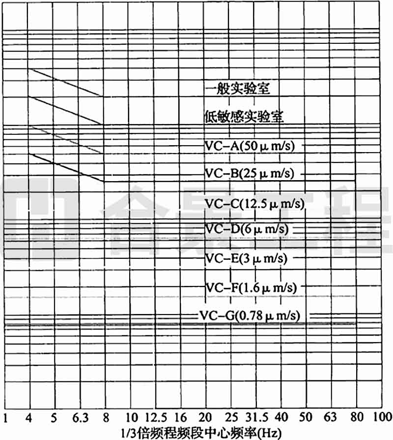 A.0.1 拉丝塔的容许振动参数可按精密设备、仪器容许振动通用标准曲线(图A.0.1)中VC-B(25μm/s)曲线确定。